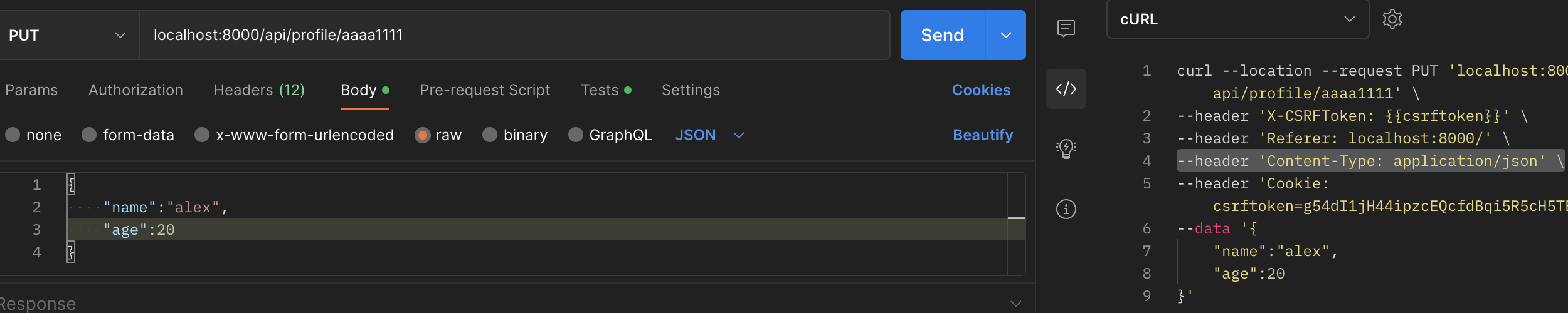 위와 같이 body - raw - json을 선택해서 json 형태로 데이터를 작성해서 보내주면 된다. 코드를 보면 content-type도 잘 되어있고 body에 데이터에도 JSON 형태로 저장됨을 알 수 있다.