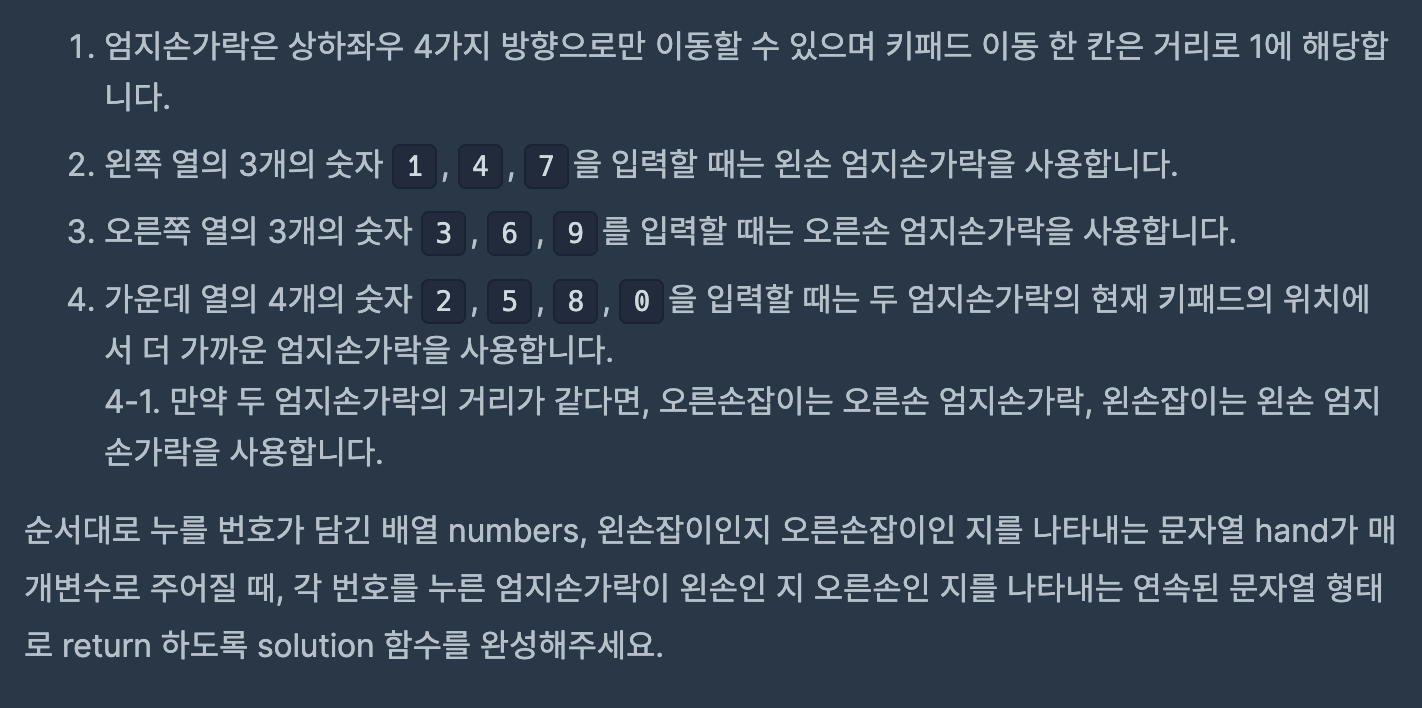 return answer예전 방식은 각 숫자가 키패드에서 위치한 지점을 2차원 공간좌표 형태로 리스트에 저장하여서 사용하였다. 이것보다 더 깔끔하게 표현할 수 있는 방법을 고민해보았다.