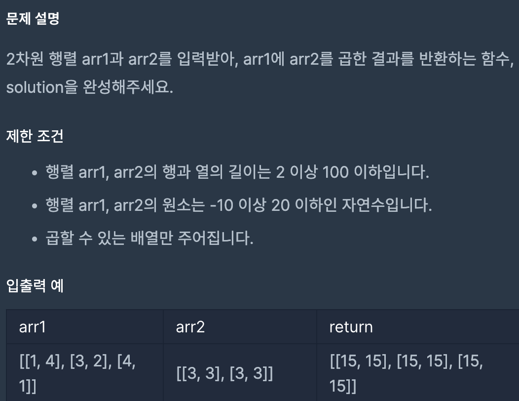 문제 이해: 두개의 이차원배열이 주어진다. 행렬 곱은 다음 사진과 같이 진행한다.